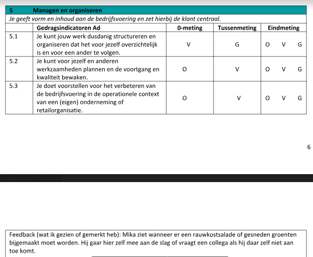 5.2 en 5.3 zijn nog wel wat om te kunne verbeteren. Ik snap dat mijn bedrijfscoach hier nog niet helemaal tevreden mee is en ik daarom ook nog geen goed daarvoor heb. Ik denk bij 5.2 dat ik het voor mijzelf wel kan plannen, maar dat ik dat voor anderen nog niet zo goed kan. Bij ons is het natuurlijk ook heel anders als het bijvoorbeeld heel erg druk is. Hierdoor kan ik wat minder goed iemand aansturen die bijvoorbeeld ook de kassa aan het doen is.
