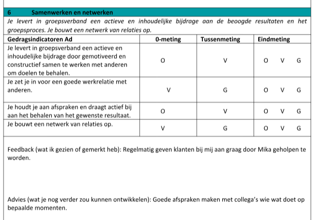Ik heb hier 2 goed en 2 voldoendes die ik nog kan verbeteren naar een goed. Ik ben het hier zelf ook mee eens, want soms als ik er niet ben hoor ik van collega's dat mensen naar mij vragen en zeggen dat ik altijd heel hulpzaam en vriendelijk ben. Natuurlijk ook heel leuk om te horen. Ook snap ik wel dat de andere 2 een voldoende zijn. Soms (vooral de zaterdag) kan ik wel een iets minder gemotiveerd zijn. Ook vooral omdat ik dan vrijdag avond het te laat heb gemaakt en ik dan zin heb in het weekend. Hier kan ik wat volwassener in worden alhoewel dit wel vooruitgang boekt. Straks hoef ik niet meer op de zaterdag te werken en vergeleken met eerst ben ik de laatste zaterdagen wel wat minder brak.