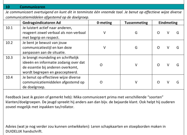 De 10.3 en 10.4 kan ik nog zeker verbeteren. Veel ideeën of informatie zeg ik wel, maar ik schrijf niks op. Ik vind het altijd erg zielig voor oudjes en probeer hun zo goed mogelijk altijd te helpen. Wel is mijn handschrift niet te lezen. Ik moet dit gaan leren maar hoe heb ik geen idee bij. Misschien kan ik daar een nieuw leerdoel van maken, omdat ik er al 1 heb gehaald.
